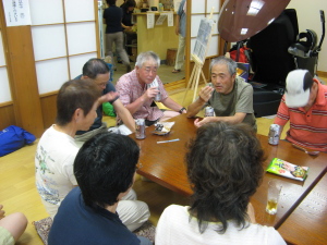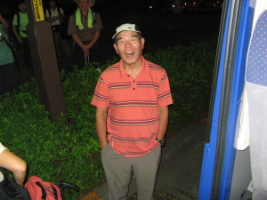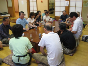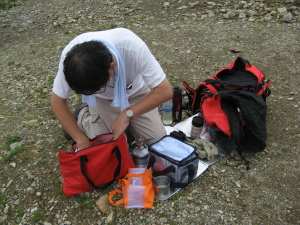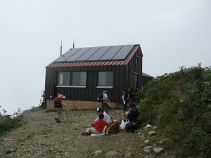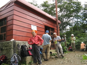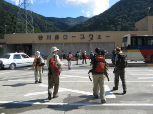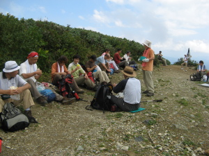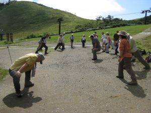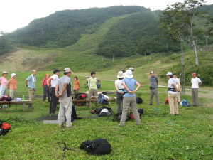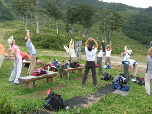 今日は 模範登山ですね 天神平で、クールダウンのストレッチ? いや 宴会のための ストレッチだよ |