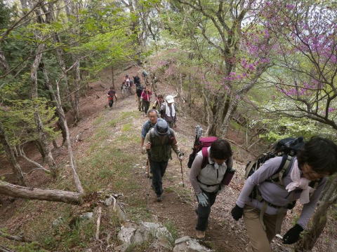| 東日原(617m)8:09→ヨコスズ尾根→一杯水避難小屋10:51/11:00→三つドッケ(1576m)11:30/12:00→一杯水避難小屋12:25/40→ヨコスズ尾根→東日原バス停14:25 早い集合時間にも拘わらず、奥多摩駅に着くと参加者は18名に増えていた。今日は東日原行きバス増便も出て、2台のバスで東日原に着いた。新会員のヒラさん(別名ヒラリン)を紹介してから、全員で自己紹介する。和やかな雰囲気の中、限定10枚で用意した地形図を配り、今日のコース説明をする。ストレッチをして、ゆっくりスタートした。 計画では倉沢林道から入り、棒杭尾根を登る予定だったが、大雪被害で倉沢林道上部が崩壊している為、安全策を取り、ヨコスズ尾根往復に変更した。ヨコスズ尾根登山口は間違え易く、車道から戻ってきた他の登山者もいた。 民家脇を過ぎると九十九折れの急坂が始まる。今日は新会員や久し振りに参加した会員もいるので、ゆっくりスローペースで歩く。 予報では暑くなるということで、衣類調節と水分補給の為30分毎にコマメに休憩した。 滝入りの峰の巻き道は細くなっていて要注意であり、慎重に歩いた。植林帯は花が少ないが、ミミガタテンナンショウ・フタリシズカ・クワガタソウ・チゴユリなどが足元に咲いていた。 一杯水の手前で休憩すると、近くの斜面の緑が白く輝いている。シロヤシオが見事に咲いている斜面だった。 そこから三つドッケまで、ミツバツツジ・山ツツジ・シロヤシオが溜め息が出るほど美しく咲き誇っていた。三つドッケへの急登も花を愛でながらなので、苦では無かった。三つドッケ手前にはマイヅルソウの群落もあった。 山頂では曇っていて、遠望は利かず富士山は見えなかったが、石尾根を始め、大岳山・御前山・川苔山・蕎麦粒山等奥多摩の山々が見えた。山頂でランチ休憩すると、下山後の新会員歓迎会を兼ねた反省会に向けて気分は切り替わる。 ハナド岩まで足を延ばす予定であったが、ハナド岩は狭く5~6人がやっとの場所なので省略し、総勢18名、このまま往路を戻ることにした。一杯水避難小屋で、一杯水を汲みに行く時間を取り、下山開始する。 アルコは下山得意なメンバーが多いが、膝を痛めないようにゆっくり下りていく。狭いトラバース道手前でも休憩し、疲労を溜めないように、集中して歩けるよう配慮した。メンバーが楽しくおしゃべりする声を聞きながら、満足して頂けた様子に安堵する。 参加された皆様、お疲れ様でした。ポートして頂いて感謝致します。 |