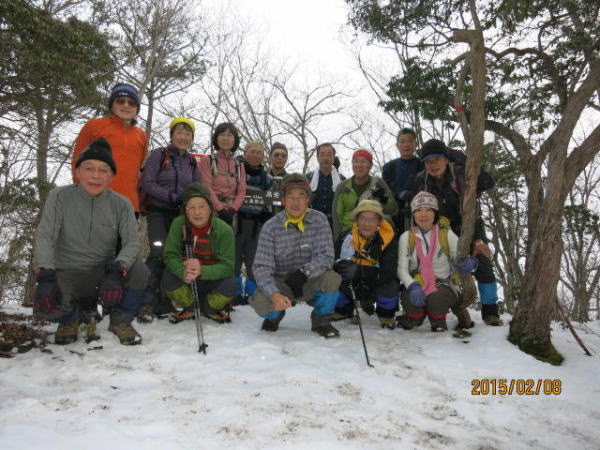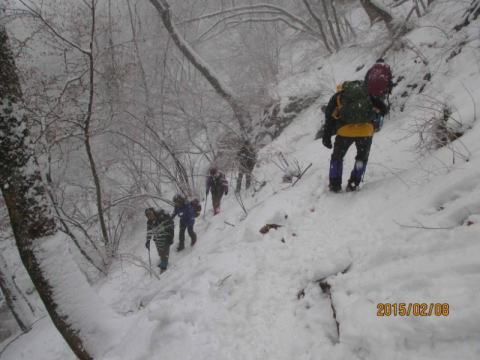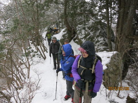 | 当日の天気予報は芳しくなかったが、山は雪であろうと踏んで計画を遂行した。参加者は3,4人程度か最悪単独行も覚悟で家を出た。予想に反し、五日市行きの車中で13人、更に養沢行きのバス停で1人が加わり14人が顔を揃えた。途中から貸切となった路線バスを、大岳鍾乳洞入口バス停で下車、養沢神社でストッレチ体操の後、7:40分に高岩山登山口へと入る。 取付きから急登である。期待していた雪は無く土肌が露出している。ゆっくり登っているつもりでも汗ばんでくる。35分程高度稼ぐと、全員が揃える平坦地となり、衣服調整を兼ねて休憩した。 再び登り始めるも雪は現れない。標高710m炭焼き釜跡に到着したのが、8:50分ここで5分の小休止を摂り、高岩山を目指す。この辺りから所々に凍結した雪が出始めた。岩場も出現し幾らか緊張感のある尾根歩きとなって来た。 油断していると滑るがアイゼンを履く程ではない。空からは粉雪が舞い始めた。予想通り雨でなくほっとする。残雪の高岩山に到着したのが9:40分、ここで記念撮影と約70mの下降に備えてのアイゼン装着等で15分を費やし、昼食予定の展望台へと向かう。 鞍部に降りてから再び急登を喘ぐ。アイゼンが有効となったり、煩わしくなったりの雪の状態だ。深ン沢と中の沢を分ける尾根に合流すると展望台はもう間近だ。 10:30分展望台に到着した時には、本降りの雪となって来た。それでも到着当初は奥の院から御岳山、日の出山などが確認出来る程度の眺望は得られた。ここは我々貸切のレストラン、1時間の昼休みとし、コンロを使用したり各自おもいおもいの昼食となった。アルコでは長いランチタイムが不慣れなせいか、30、40分もすると、時間の使い方に戸惑う者も出てきた。暫くすると、本日始めて出会う登山者が現れたのを期に腰を上げた。 上高岩山は縦走路から10m位外れた小高い所で、軽く挨拶だけをして先を目指した。巻き道を避け尾根通しに芥場峠へと向かう。ここからは本格的な白い世界となり、降りしきる雪の中、踏み跡もほとんど無く、冬景色を堪能出来た。 芥場峠着が11:45分ここからロックガーデン綾広の滝へと下った。予定では大岳~御岳の縦走路を行く積もりであったが、行交う人も無く、雪景色がすばらしいのでロックガーデンへと足を踏み入れた。踏み跡も薄っすらと消す程の降雪である。雪質も湿ってきてザックに纏わり付く様になる。 途中の休憩舎でトイレ休憩とし、少し遅くなったがザックカバーを付けた。天狗岩の分岐に着いたのが12:50分、七代の滝方面は滑りやすい鉄の階段があり、これを嫌い左に進路を摂り、長尾平分岐でアイゼンを外した。ここからは毎年の新年会で通い慣れた道だ、ケーブル山頂駅に着いたのが13:45分、ここで解散とした。 降水確率50%以上での山行実施であったが、登山者も少なく、賑やかな山域の中で反って静かでミニ雪景色も味わう事が出来た。参加者の皆さんにも、楽しんで貰えたのではないだろうか?。 |