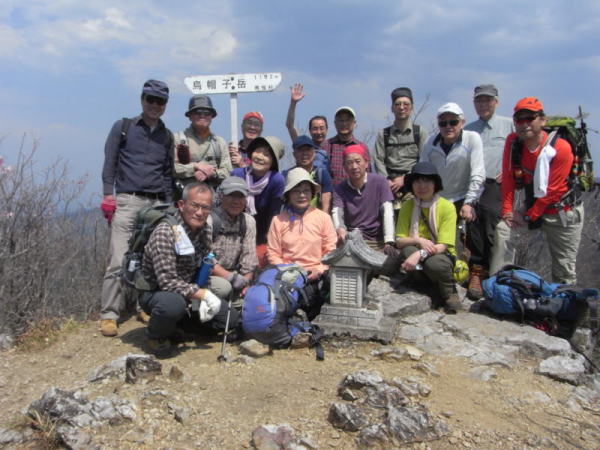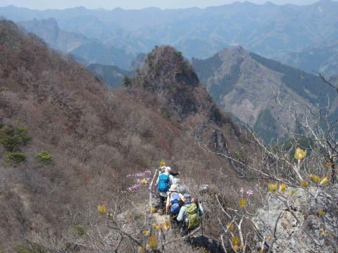 | 天狗岩登山口9:10→天狗岩10:10→シラケ山10:45→P712:00→巻き道分岐(昼食)12:10 12:45→烏帽子岳13:00→コル13:30→下山口14:50 西上州の山はアルコでも初めての山域という事で、何時もとは違うという感覚である。 今日はいろいろな情報から判断して、下山口を登山口に変更して実施することにした。 長い(3.3㌔)湯ノ沢トンネルを抜け、さらに高度を上げてゆくと標高859mにある登山口に到着した。駐車場にはすでに多数の車があり、人気の山と思われる。 ウォーミングアップをすませ、まずは天狗岩をめざし「ニリン草群生地コース」 となずけられた沢沿いの道を好天の中ユックリペースで歩く。やがて沢と別れてコルの上に出ると天狗岩にはあっけなく着いた。その先には手すりの付いた橋があり展望台から妙義山方面が春霞の中のぞめた。 アカヤシオの花も鮮やかに見えるようになると、シラケ山と思われるピークから岩稜ルートと横道ルートの分岐があり、横道ルートを行けば次の分岐まで20分で行けるが、岩稜コースではアップダウンがあり80分もかかる。本日一番のハイライトであり迷う処ではあるが、前方には烏帽子岳が意外と近くに見える。意を決してコブの連なる狭い尾根を行くと、恐怖感もそれ程なく七つのピークも夢中で越えるとお腹もすいて昼食にする。 最後の目的地である烏帽子岳はロープが頂上まで伸びていて、狭い頂上は記念写真を撮るのにも苦労し、早々に下山にとりかかるが、烏帽子岳のコルから奥の二股まではロープが張ってあり伝いながら急降下する。落石もあり危険を感じる場所である。 勾配もおだやかになるとバスの待つ登山口である。 今日は大勢のメンバーが狭い稜線に乗ると、山が狭く感じる、不思議な感覚がしました。又多くの方の協力で、とにかく無事に終えることができました。 |