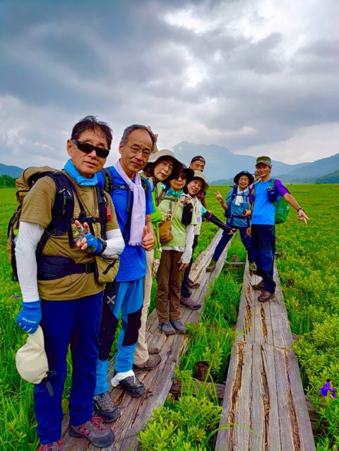 | 1日目 9:55 鳩待峠(1591m) 11:08 山ノ鼻 (昼食) 11:40 12:57 龍宮小屋 13:38 弥四郎小屋(1400m) 距離 9.3km 時間3時間43分 登り8m 下り194m 2日目 5:00 弥四郎小屋(1400m) 5:18 見晴新道分岐 9:18 柴安嵒(2356m) 10:10爼嵒 (2346m) 昼食 10:40 11:03 ミノブチ岳 13:53 尾瀬ビジターセンター 14:36 三平峠 15:40 一ノ瀬(1620m) 距離15.8km 時間10時間40分 登り1096m下り1221m 『燧ヶ岳』山行は昨年 一昨年と天候不良で中止 今年で三度目の正直となるが 今年も天気予報は悪く鳩待峠の歩き出しから雨を覚悟していたが幸運にも2日ともほとんど雨や雷にもあわずにすんだ。 尾瀬ヶ原歩きでは ニッコウキスゲ・カキツバタ・コバイケイソウなどの美しい花々が 池塘にはヒツジグサの花にアカハライモリも姿を見せてくれたが いつ雷雨になるかわからない予報のため尾瀬ヶ原の最短コースを急ぎ足で縦断していると 案の定もう少しで弥四郎小屋というところでパラッときたので雨具を着けたが幸運にも小屋までは何とかもってくれた。 我々が部屋でくつろいでいると何やら外が騒がしい 何事かと思えば外は『雷雨』なんとその中をカッパを着てリュックを背負った4~5歳くらいの園児たちが次から次へと木道をトコトコと歩いてやって来る 総勢70名 6時間かけてずぶ濡れになりながら鳩待峠から歩いて来たそうだ 先に着いた子供たちは後から到着する子たちを歌を歌って応援して出迎えるという微笑ましい“ Scene ”にも出会うことができた。 2日目は朝もやにけむる幻想的な尾瀬ヶ原と至仏山を眺めながら5時に出発 今日登る見晴新道は2013年の台風の土石流で登山道が流出しその後登山道が付け替えられ現在は「登山道整備ツアー」と称して一般ボランティアも巻き込んで整備を始めているそうだが まだまだ荒れた登山道で歩きづらい道が続いたが9合目までくると鮮やかな緑色のハイマツのなかに美しく咲くシャクナゲの花に癒された。 9:18燧ヶ岳最高峰『柴安嵒』2356mに到着 振り返れば尾瀬ヶ原や至仏山など360度の大展望が楽しめるはずだったが柴安嵒・爼嵒ともに残念ながらガスがかかって絶景を見ることはできなかった。 爼嵒から下山した長英新道も非常に荒れた道で 体調が万全ではない人もいたがメンバーみんなの頑張りで全員無事下山することができた。 次回は是非 東北以北最高峰『燧ヶ岳』山頂からの360度の大絶景を眺めてみたいものだ!! 会計報告 【収入】 ①参加費 26100×8= 208800 ②JT1名キャンセル料 12940 収入合計 【221740】 【支出】 ①宿泊費 13000×8= 104000 ②JT料金 50000×2= 100000 高速代 3870×2= 7740 ドライバー宿泊代 9000 大清水駐車場代 1000 計 117740 支出合計 【221740】 |