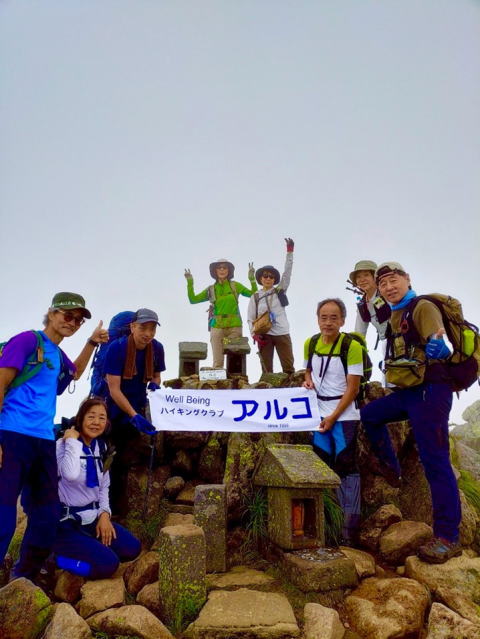 柴安嵒』(2356m)・『爼嵒』(2346m)ともにガスがかかって 残念ながら尾瀬ヶ原や至仏山など 360度の絶景を楽しむことはできなかった (爼嵒山頂にて) |