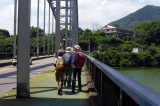 | 相模湖MOROMORI前バス停8:45→登山口8:50→鼠坂→嵐山山頂11:10→昼食11:45→嵐山登山口12:25/12:35→相模湖大橋→相模湖駅13:00 所要時間(昼食・休憩除く) 3時間 歩行距離約4.9㌔ 上り累計標高差361m、下り389m 「低山侮りがたし」、単純に登って下る低山ではなかつた。嵐山の裏側から登り表に出たが裏山は中級レベルで変化に富んでいた。今回も下見無し、当日が本番であり、予想外なことが多かつた。 わずかに上るとそれ以上に下る、繰り返しであり、下つたところで小さな沢に小橋がかけられており、慎重に一人一人わたる。小橋は5回に及んだろうか。最後の小橋を渡ると尾根にでてあえぎあえぎ上ると嵐山頂上406mだつた。頂上は広く開放感がある。相模湖方面の展望は良いが多少は樹木の整理もしてほしいところだ。 下りは広い山道であるが疲労感もあり慎重に下る 反省点多い。グレ-ドは初級「1」でなく中級に近い。参加者からグレ-ド初級1であり、靴も登山靴でなく、ストツクも持参しなくて体調崩れるほど苦労したという。 気温36℃の猛暑であり、上り始め大汗を掻く、ストツクを握る手が汗ですべりこまつた。 山ヒルが出るとの風評であつたが12名誰一人被害がなかつたというより山ヒルはいなかつた。 |